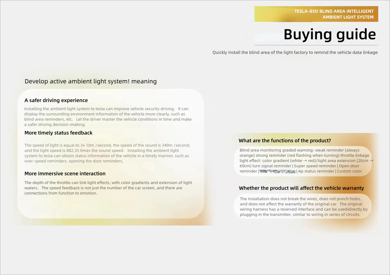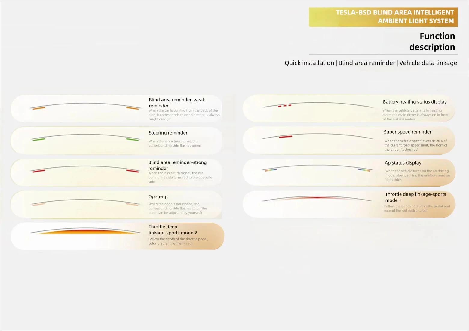 Ervaar een luxueus tintje met omgevings-LED-verlichting die worden geactiveerd bij het betreden van het voertuig.De zachte gloed verbetert de sfeer van de cabine, vooral’s nachts, waardoor uw Tesla een modern, high-end gevoel krijgt.