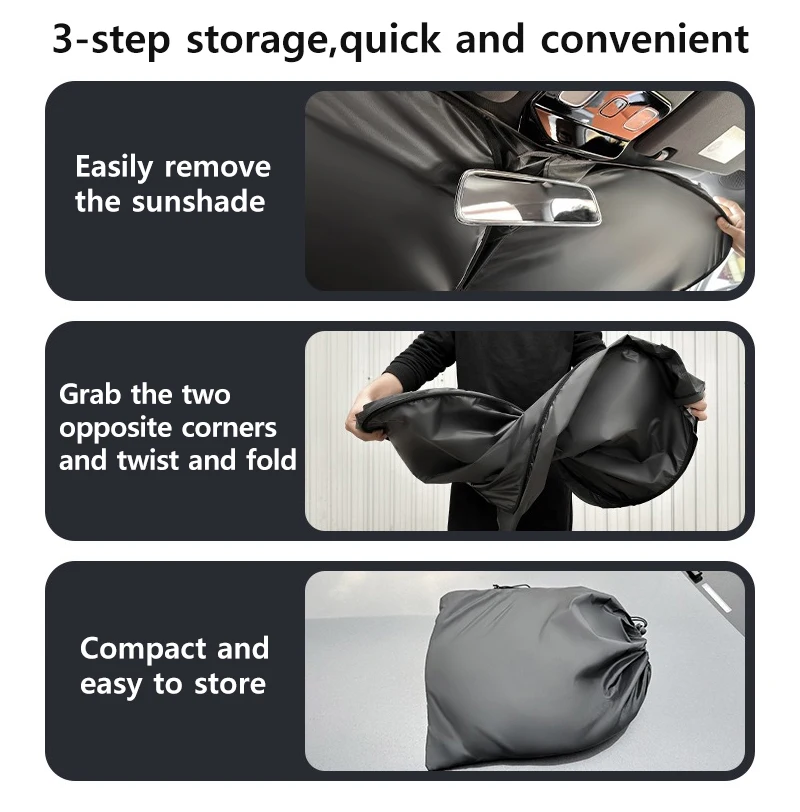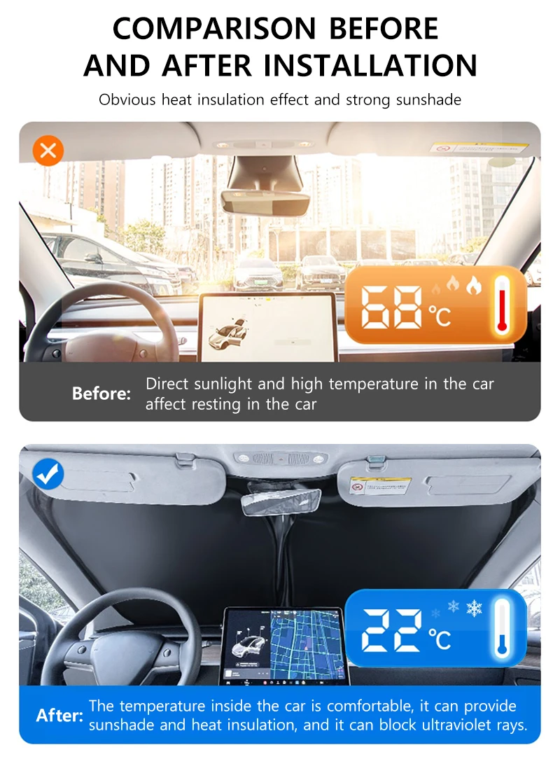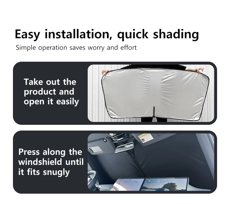 Eenvoudige installatie en opslag: het installeren van het zonnescherm is eenvoudig: zet het gewoon vast met het meegeleverde klittenband. Het zonnescherm voor Tesla Model 3- en Tesla Model Y is voorzien van vormgeheugendraad, waardoor het binnen enkele seconden gemakkelijk kan op- en neerklappen voor dagelijks gebruik. Het pakket bevat voor het gemak een zonnescherm voor de voorruit, klittenband en een opbergzakje met ritssluiting.