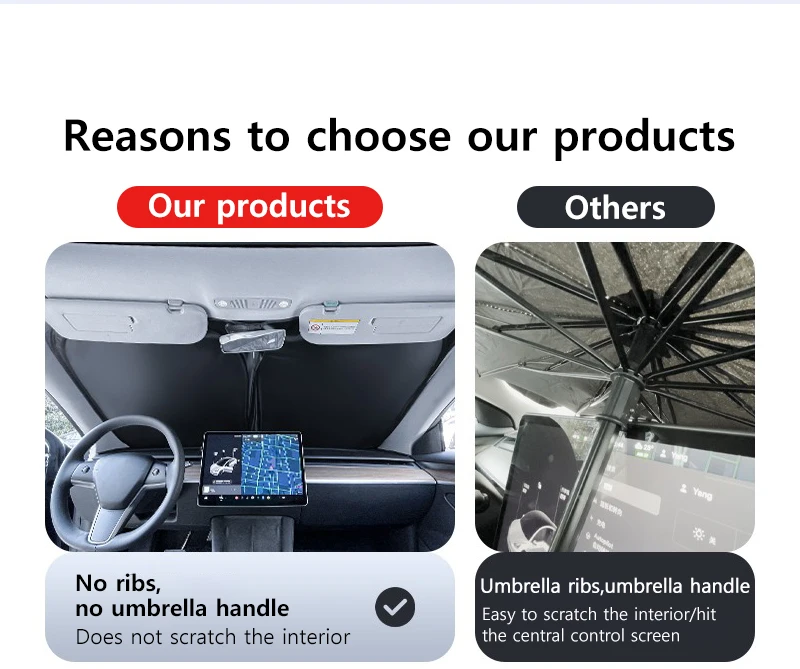 VERBETERD Aangepast ontwerp: ons zonnescherm is ontworpen om perfect te passen bij de voorruiten voor Tesla Model 3 en Tesla Model Y 2016-2024, zonder gaten achter te laten. Geniet van een probleemloze ervaring met een parasol dat perfect past zonder enige maatproblemen.