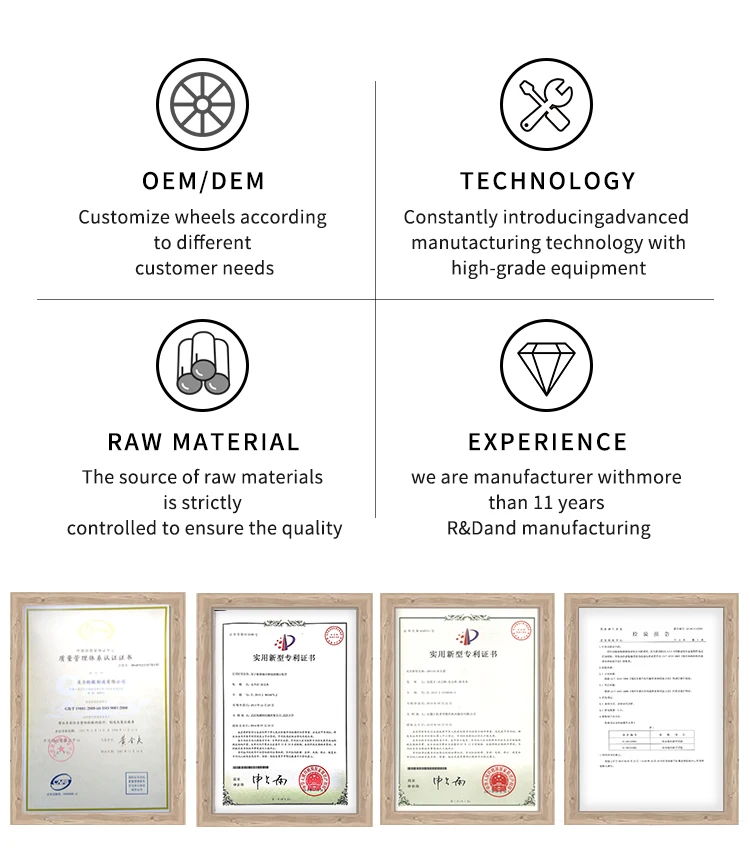 Wij zijn gespecialiseerd in R&D, ontwerp, productie en verkoop van aftermarket auto-onderdelen.Onze productiefabriek is geslaagd voor de TUV-, ISO16949- en andere gerelateerde systeemcertificeringen.We richten ons op onderzoek en ontwikkeling van productinnovatie/wielmalleninnovatie, procesinnovatie.Zeer verbeterde productprestaties en hoge toegevoegde waarde van producten, vooral geschikt voor groefwiel, diep J-wiel, PVD-kleur, waterplating en andere hoogwaardige producten. We kunnen OEM-, ODM-bestellingen accepteren.Momenteel beschikt ons bedrijf over een onderzoeks- en ontwikkelingscentrum dat is uitgerust met een röntgenfoutdetectiemachine, radiale testmachine, impacttestmachine, buigtestmachine, spectrometer en filmdikte-instrument.Al onze producten voldoen aan de JWL/VIA-normen en worden geëxporteerd naar meer dan 20 landen, zoals Europa, Amerika, het Midden-Oosten, Japan, Zuidoost-Azië, enz.Beste vrienden, als we de eer hebben om samen te werken, zullen we communiceren over productontwerp, levertijd, prijs, kwaliteit, één-op-één uitleg enzovoort en onze voordelen laten zien.Wij zullen u de beste service bieden.Bedankt!
