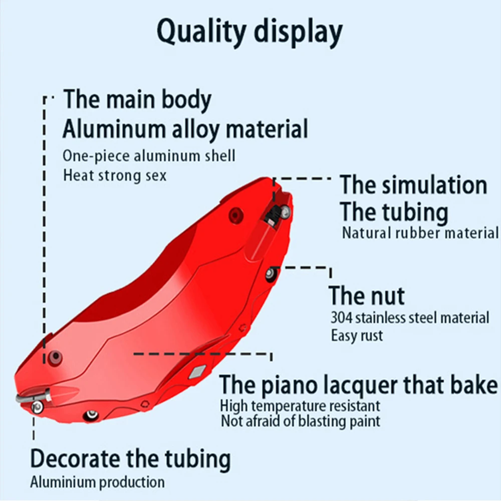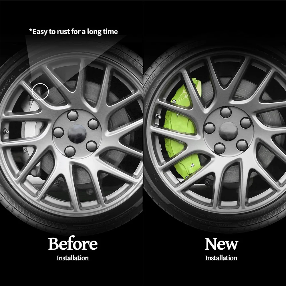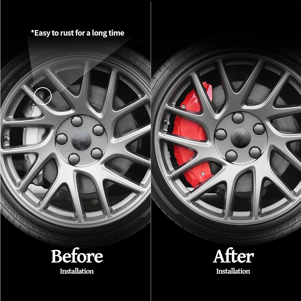 – Brake caliper covers is made of high-quality aluminum alloy material. Uses not easy loose screw and 304 stainless buckles to install on the wheel.