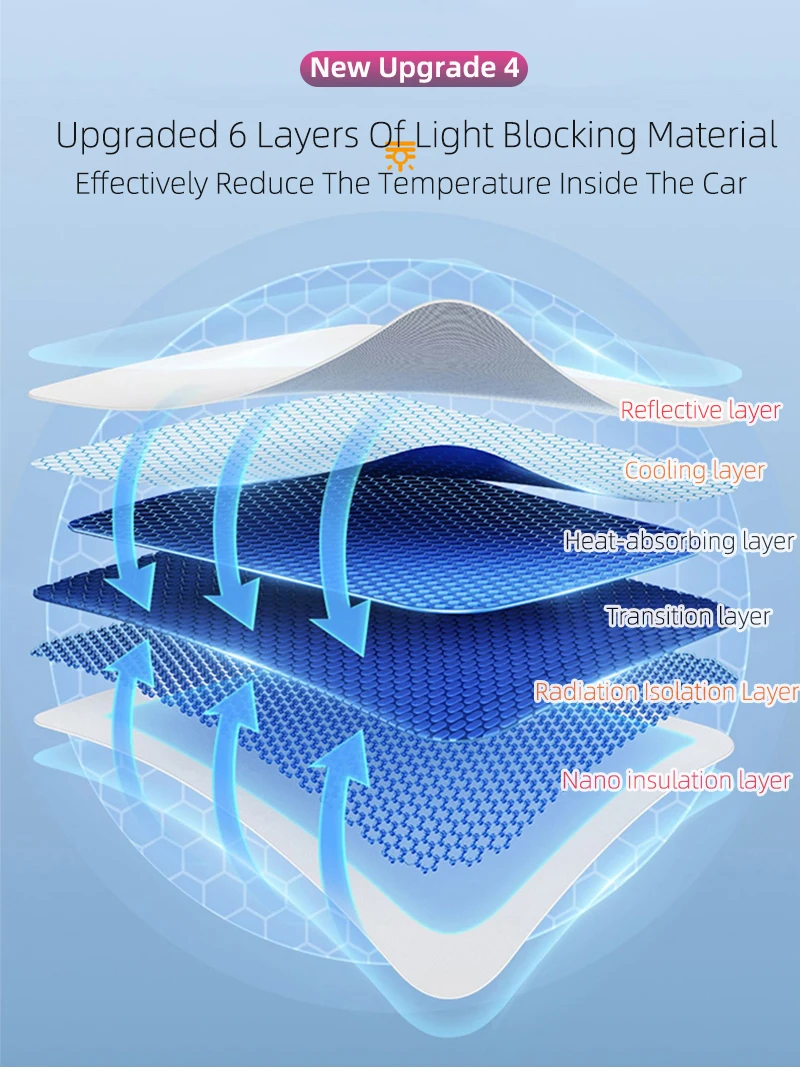 In tegenstelling tot de dubbellaagse zonneschermen op de markt hebben we deze 2-in-1 gemaakt.De zilveren laag met nanocoating aan de voorkant reflecteert UV-stralen en het materiaal met hoge dichtheid aan de achterkant blokkeert licht.